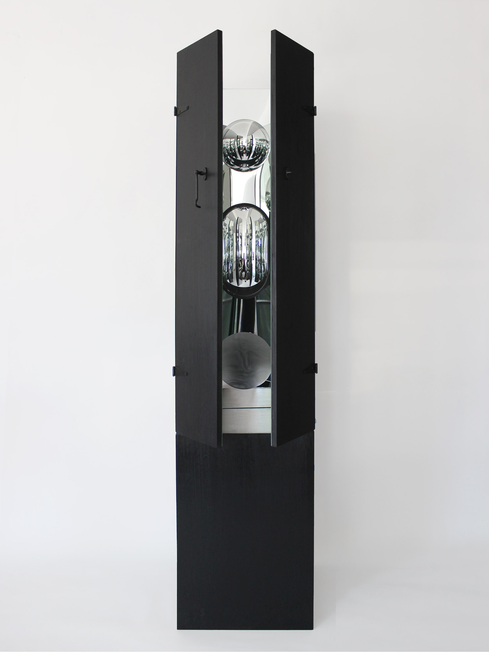 A seemingly monolithic black column is broken, revealing an infinite interior. The interior is presented as a kind of seeing machine. Three distorted lenses and repositionable mirrored doors do not provide a typical vanity mirror view; instead distortions and dynamic reflections allow the viewer to see herself in unfamiliar ways. Existing somewhere between a portable "zushi" shrine, a "wunderkammer"/curio cabinet, and a mirrored vanity, a seemingly empty box is filled with reflections of infinite ways to see oneself.